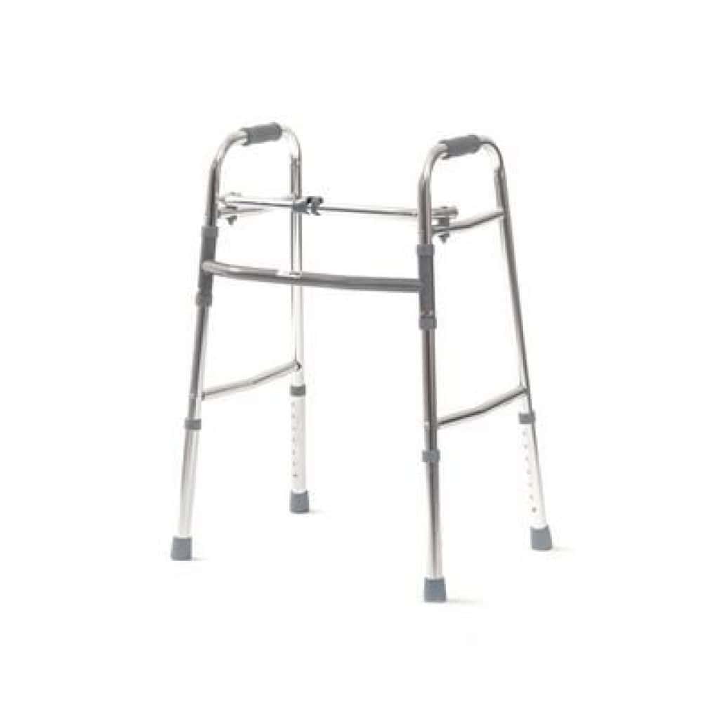 The walking frame can be easily folded for storage and adjusts in height to suit the individual users requirements.