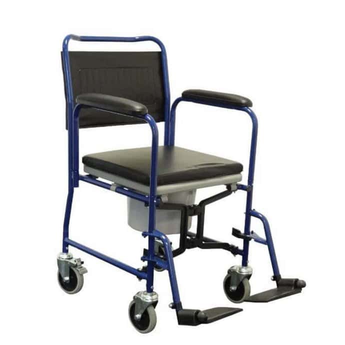 This commode transfer chair has braked rear castors, fold up footrests, 5″ swivel castors, swing away detachable footrests and drop down padded armrests.