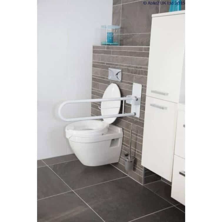 The Atlantis Fold Away Grab Rail is an epoxy coated tubular steel trombone shaped rail which is used in bathrooms to provide the user with extra support when getting off of the toilet.