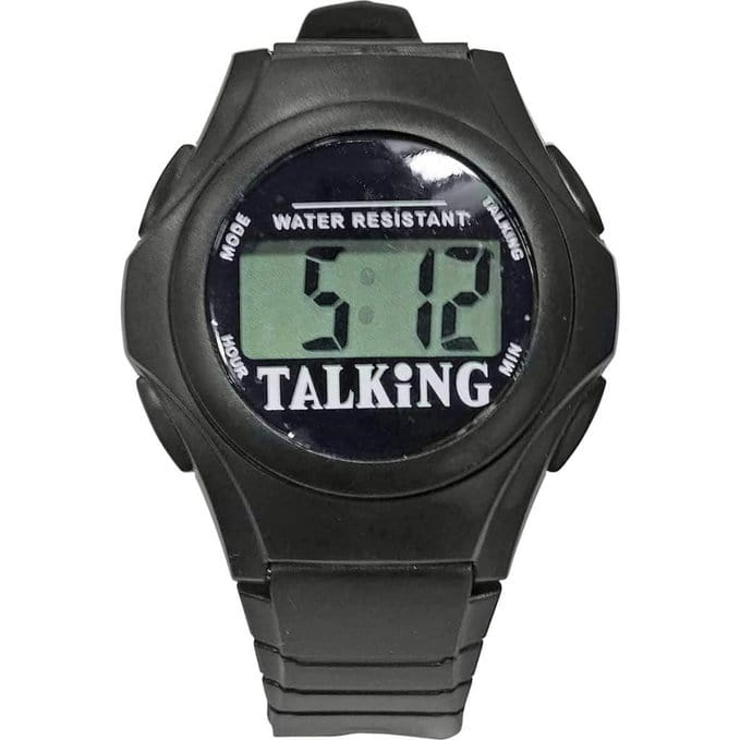 This Talking Digital Watch by Aidapt is a water resistant digital wrist watch with alarm. This talking watch has a large digital display and when pressed will speak the time.
