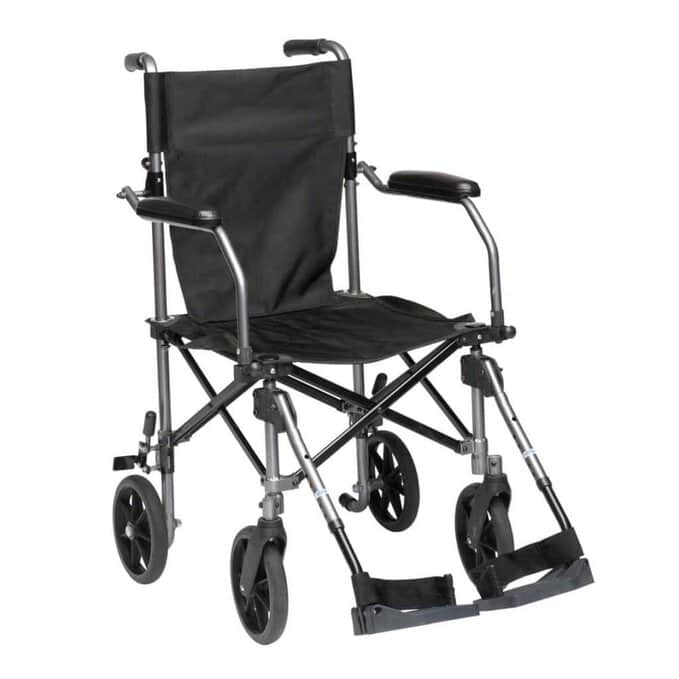 £145.00 with VAT Relief | £174.00 inc VATThe Travelite Aluminium Transport Chair by Drive Devilbiss is a very lightweight and attractive gun metal grey colour wheelchair.