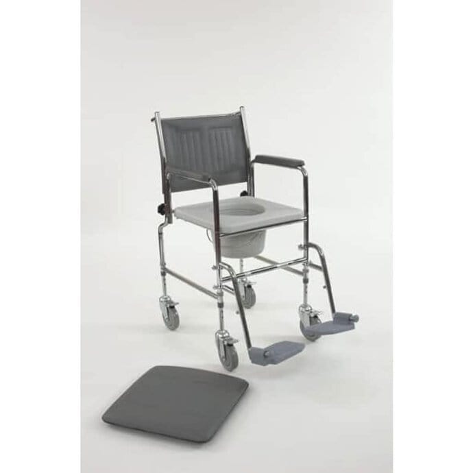 The Heathcliffe Glideabout Commode by Cefndy Healthcare can be height adjusted to suit the user and the braked castors enable it to be wheeled into position where it can be braked for safety.