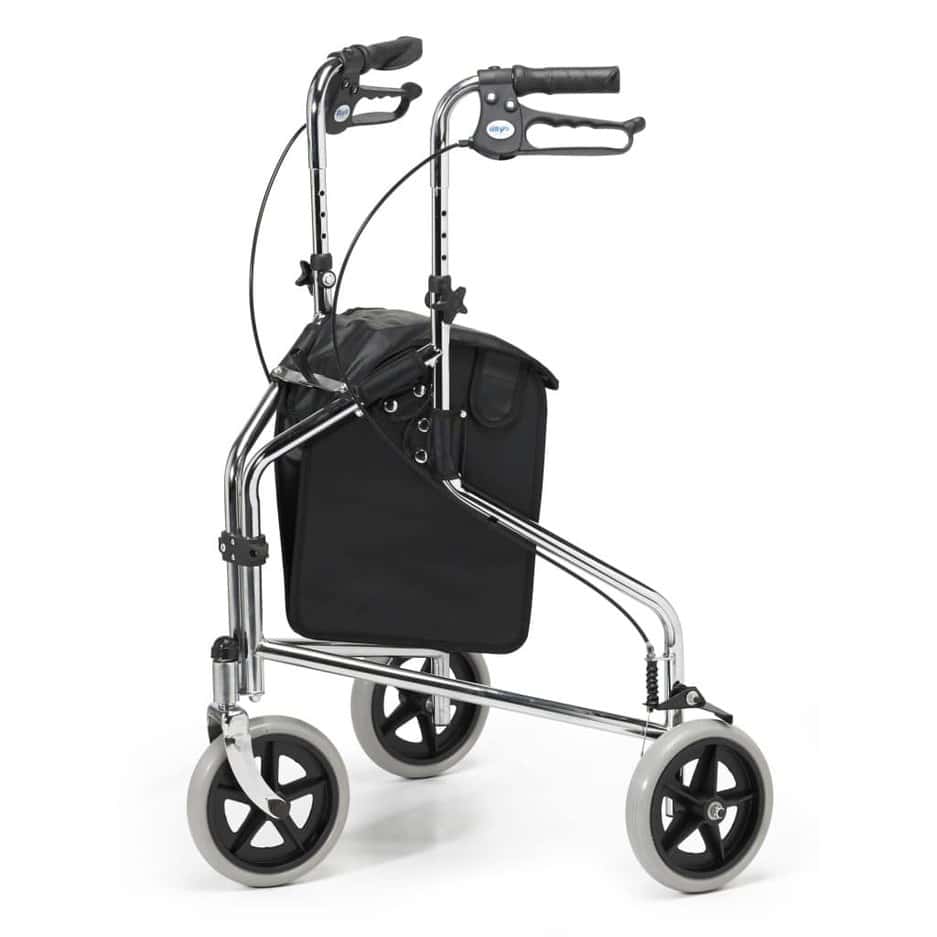 This tri walker has adjustable height handles, comfortable ergnomic hand grips, swivel front wheel and bag as standard.