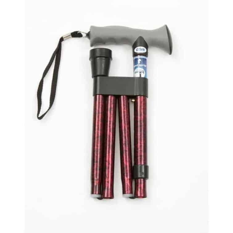 The Folding Walking Stick With Gel Grip Handle by Drive Devilbiss can be folded into 4 parts for compact storage.