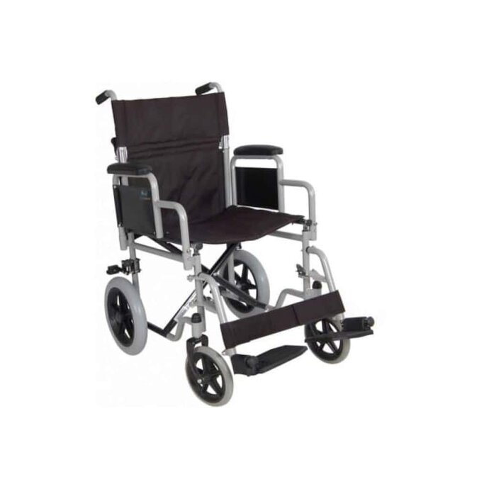 This attendant propelled wheelchair from Harvest Healthcare has a comfortable seat upholstery, puncture proof PU tyres, removable swing away footrests, a folding backrest and heel support strap.