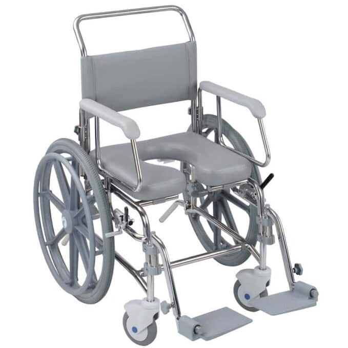 The TransAqua Self Propelled Shower Commode Chair is a high quality shower chair which is available with a large range of options and accessories. This self propelled shower chair is manufactured from corrosion resistant modular stainless steel with a HF welded seat. There are swingaway removable fixed height locking armrests, swingaway removable height adjustable legrests…